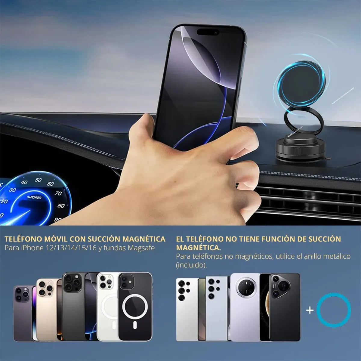 Ampliamente compatible con MagSafe: este soporte para teléfono de coche no solo funciona con iPhone 16 Pro Max/Pro/Plus/16/15 Pro Max/Pro/Plus/15/14 Pro Max/Pro/Plus/14/13 Pro Max/Pro/13/mini/12 Pro Max/Pro/12/mini/11 Pro Max/Pro/11/XS Max/XS/XR/X/8 Plus/8, sino también con Samsung Galaxy S22/21/20/10/9/8/7/6, Modelos Note 20/10 Plus, A71/51/50/10 y todas las demás marcas de teléfonos inteligentes. Además, el soporte para teléfono de coche es compatible con fundas MagSafe y fundas magnéticas para teléfonos de otras marcas.