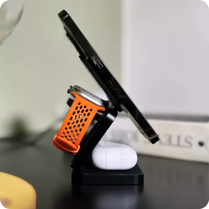 Piensa en esto: tu escritorio ordenado, tu iPhone flotando con firmeza sobre una base de aluminio sólido, tu Apple Watch cargando al costado, y ni un solo cable fuera de lugar.