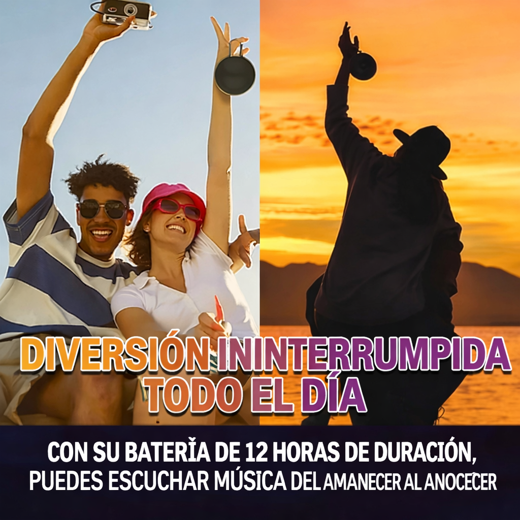 Además, su diseño circular con gancho metálico lo hace ultra portátil, ideal para quienes están siempre en movimiento. Resistente y funcional, puedes colgarlo fácilmente de tu mochila y llevarlo a cualquier lugar. Con protección IPX5 contra agua, polvo y arena, y una carcasa de goma junto con rejilla de tela que protege el altavoz de caídas de hasta 1 metro, el Santana Visión está listo para acompañarte en todas tus aventuras.
