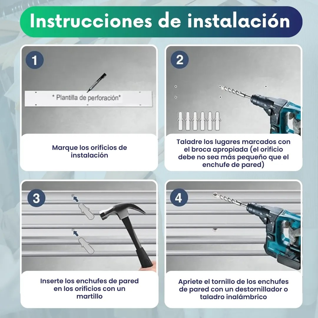 El tendero incluye instrucciones claras paso a paso y todos los tornillos y tarugos necesarios. En menos de 10 minutos estará firme en la pared.
